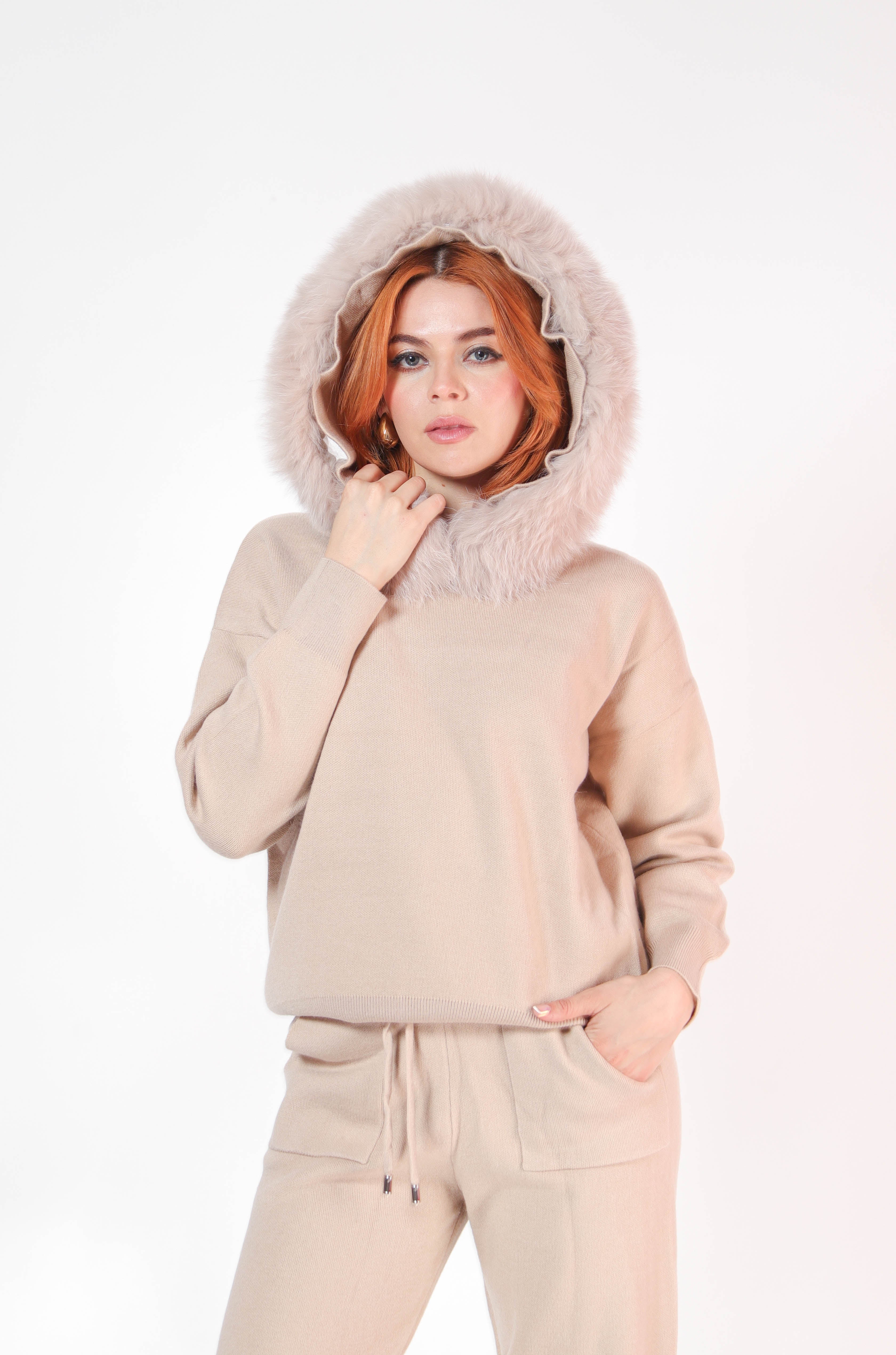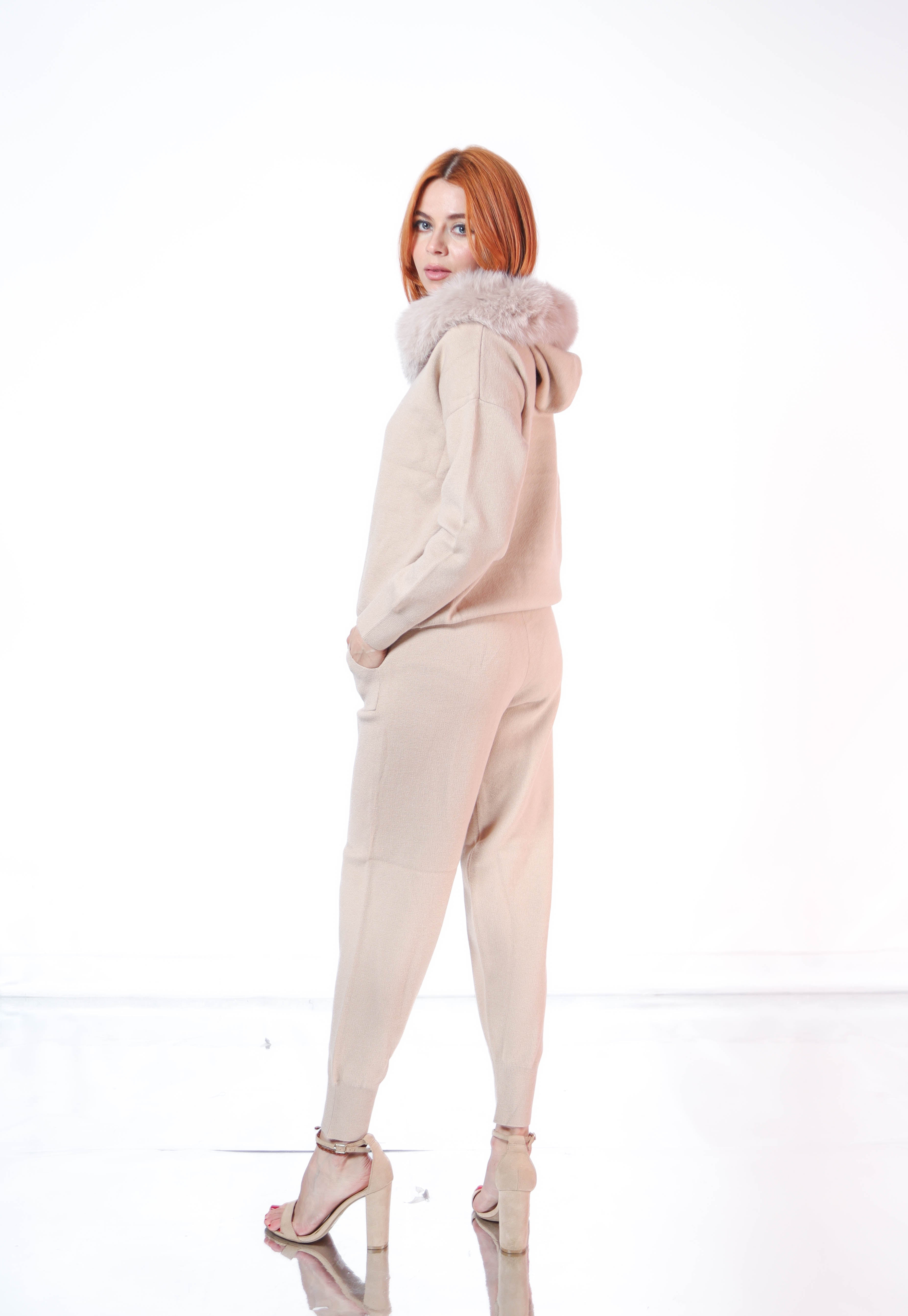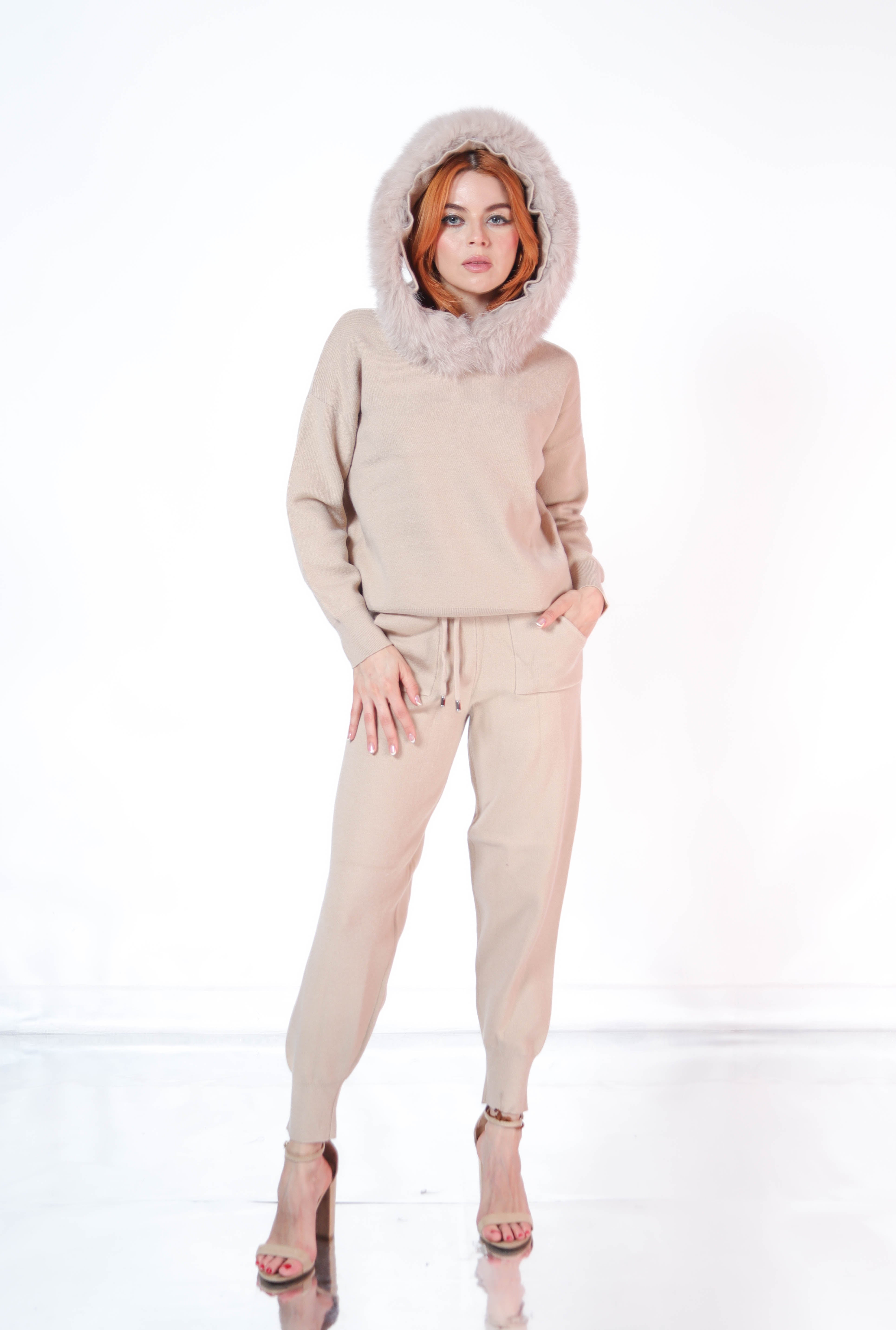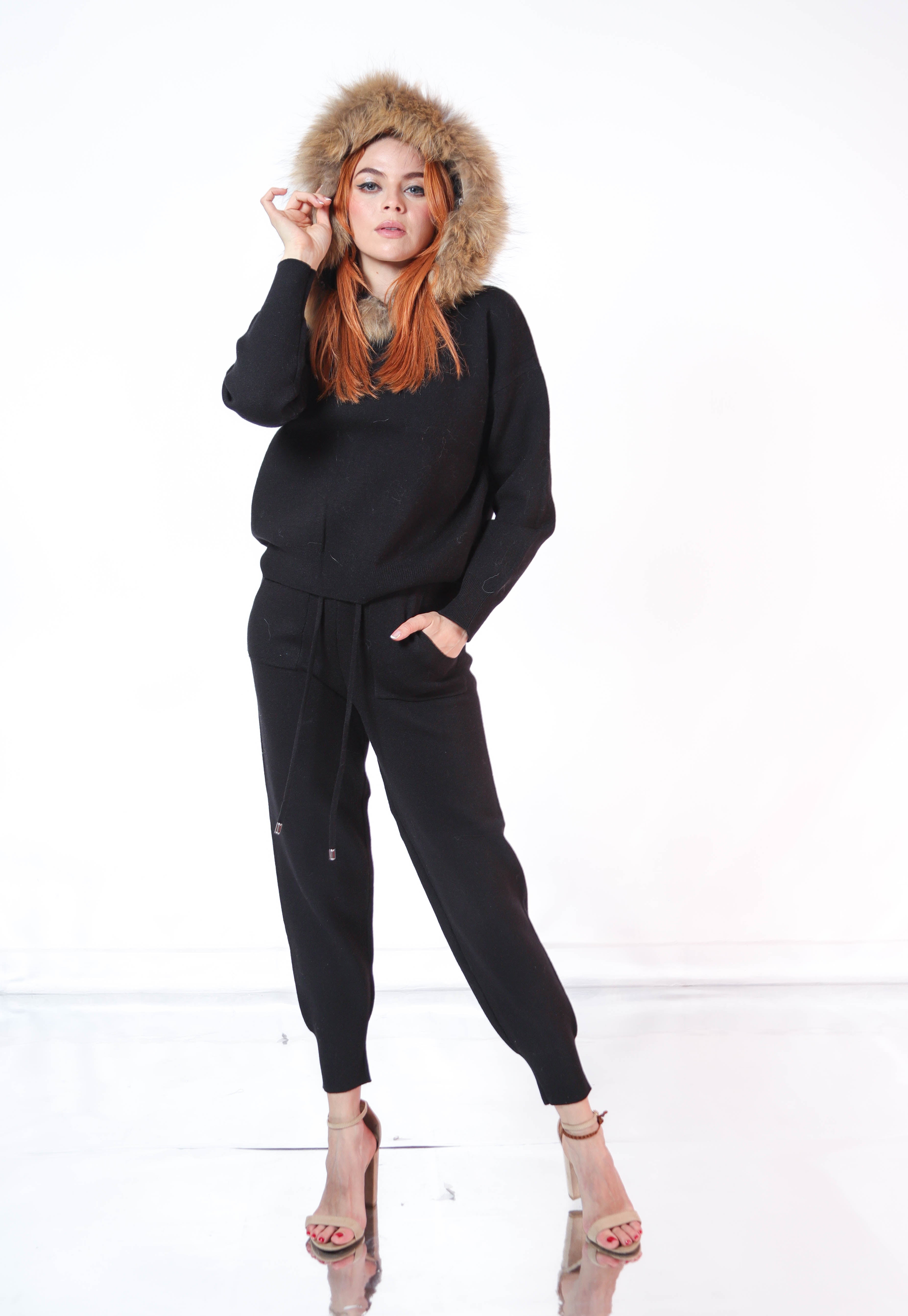 Set pantalon y sudadera de punto con ribete de pielen gorro