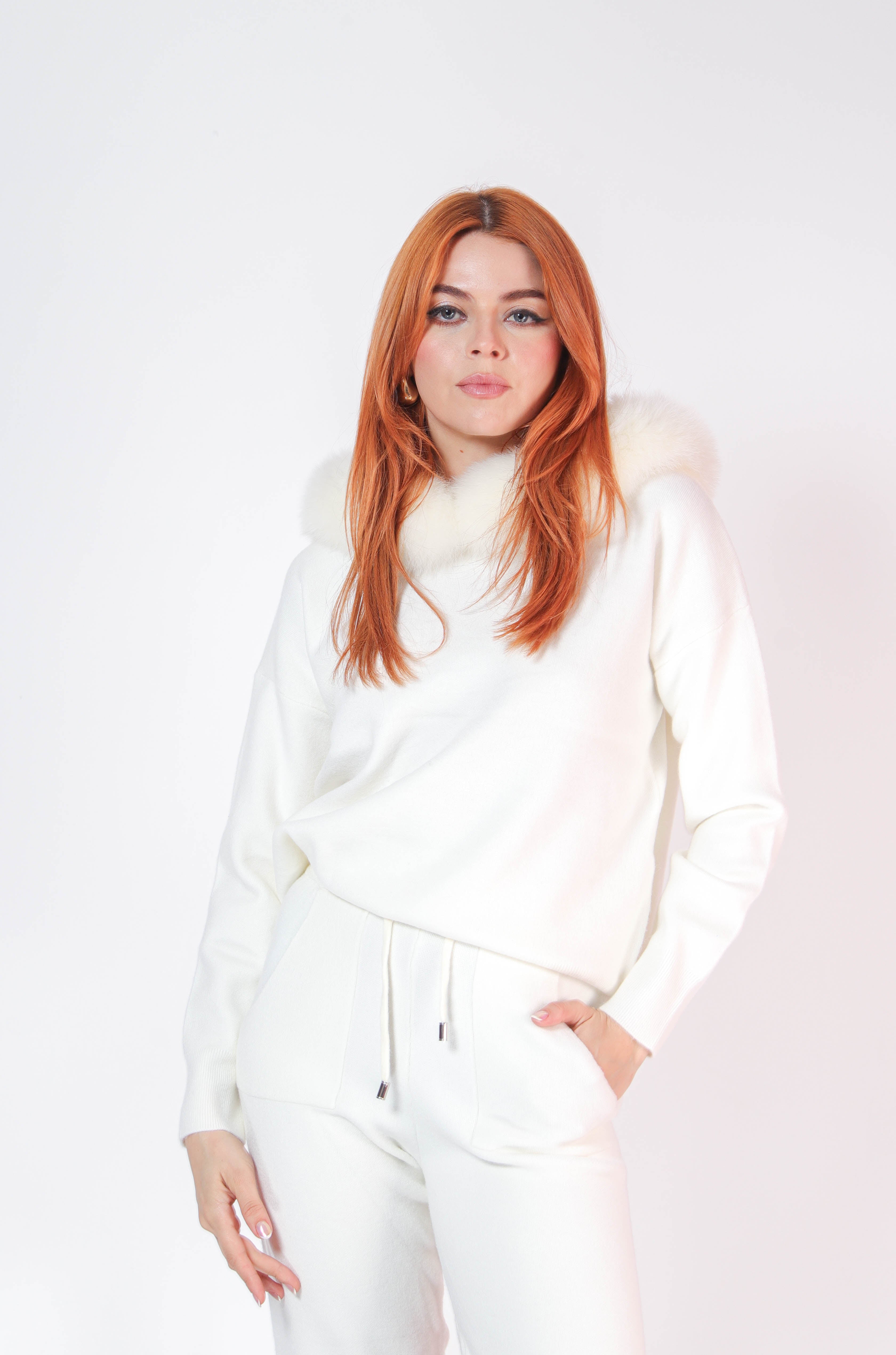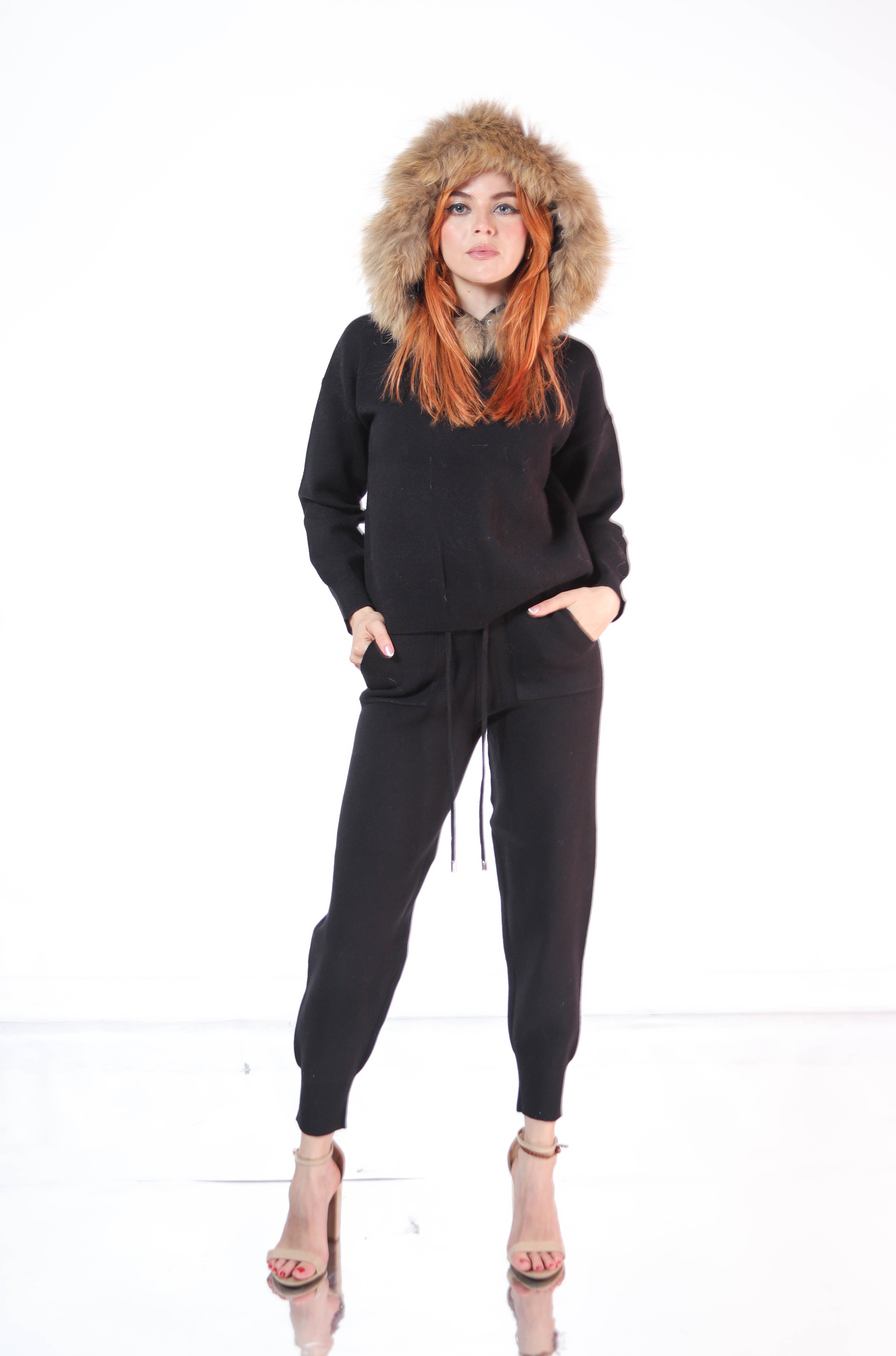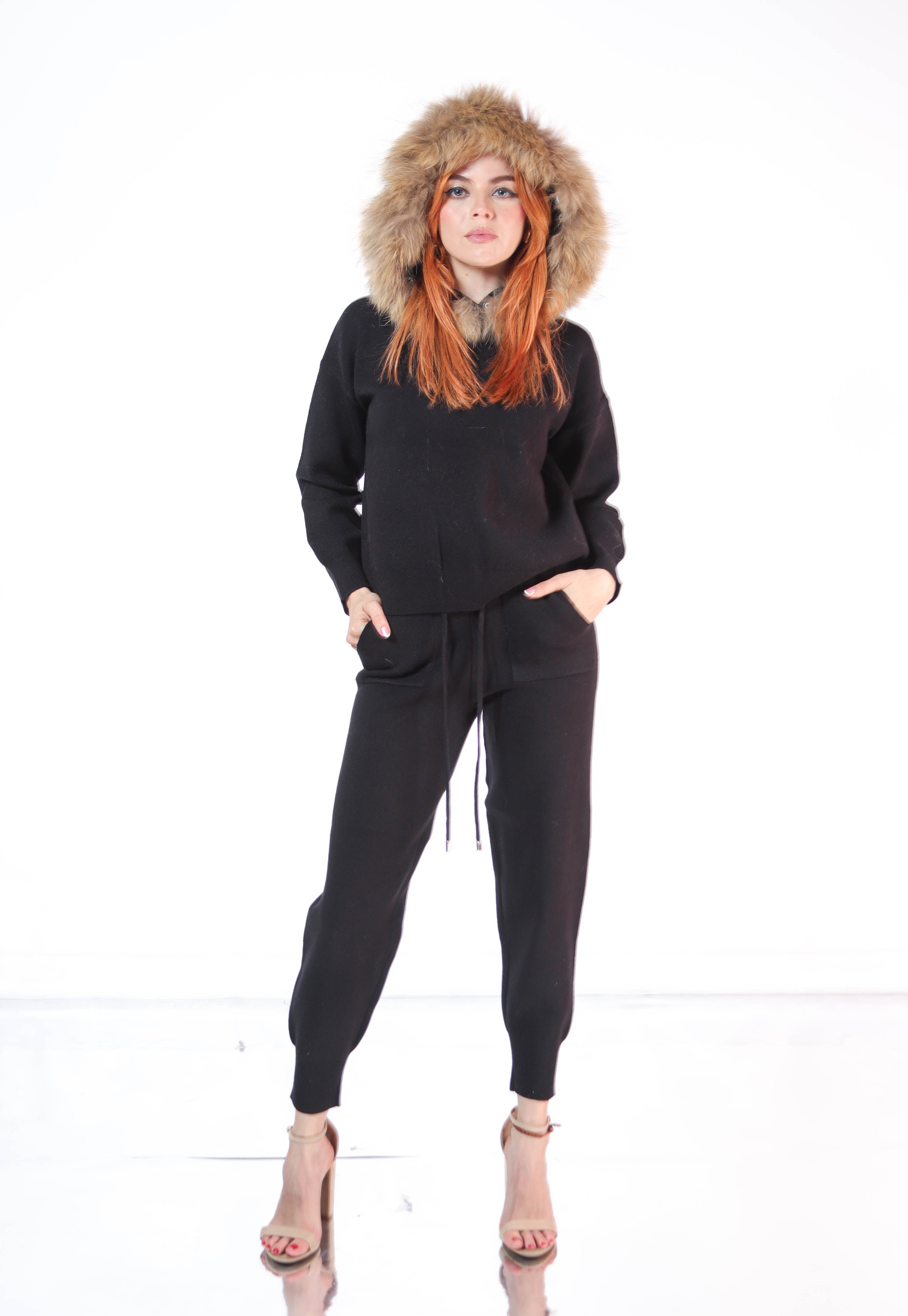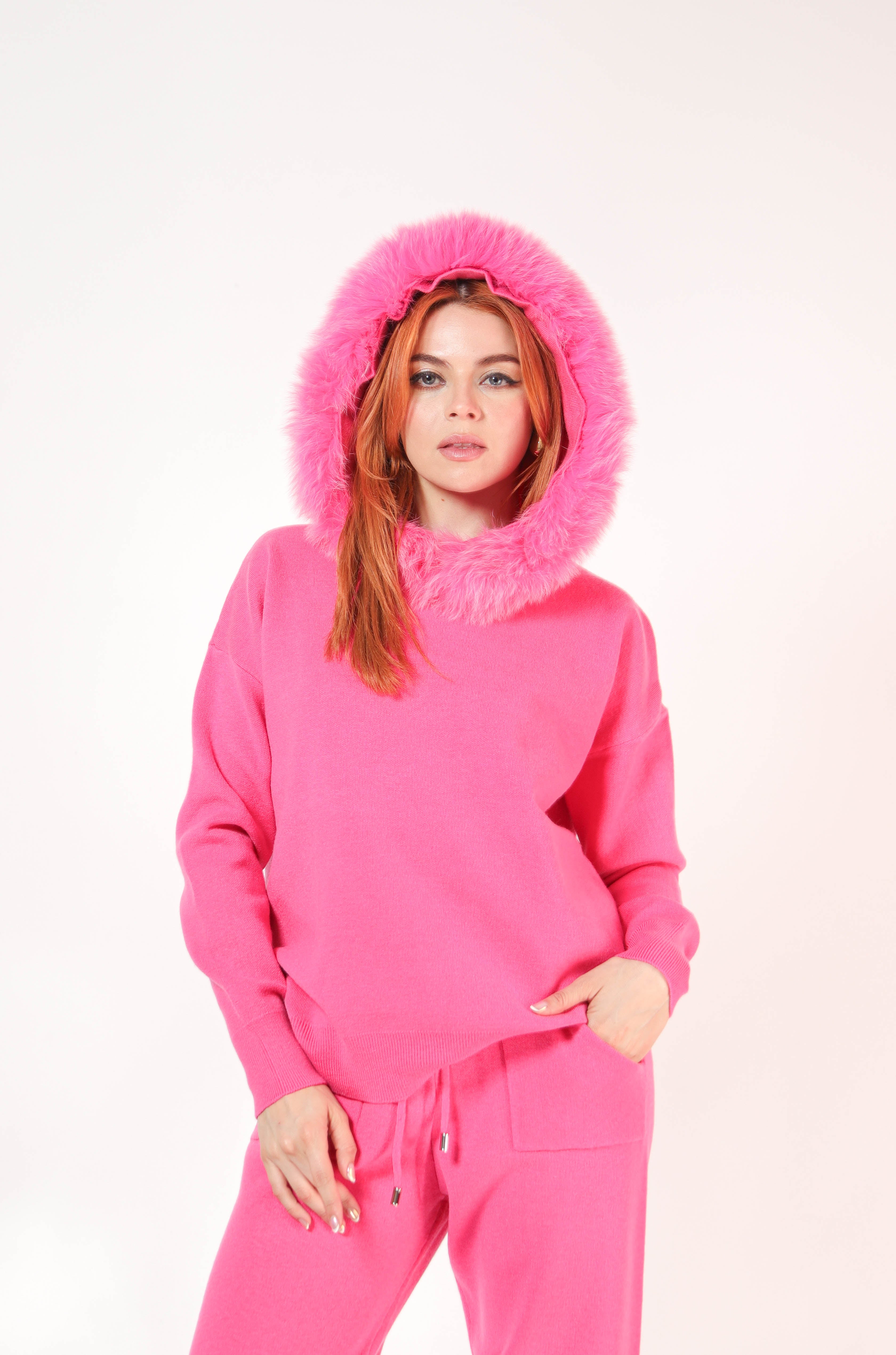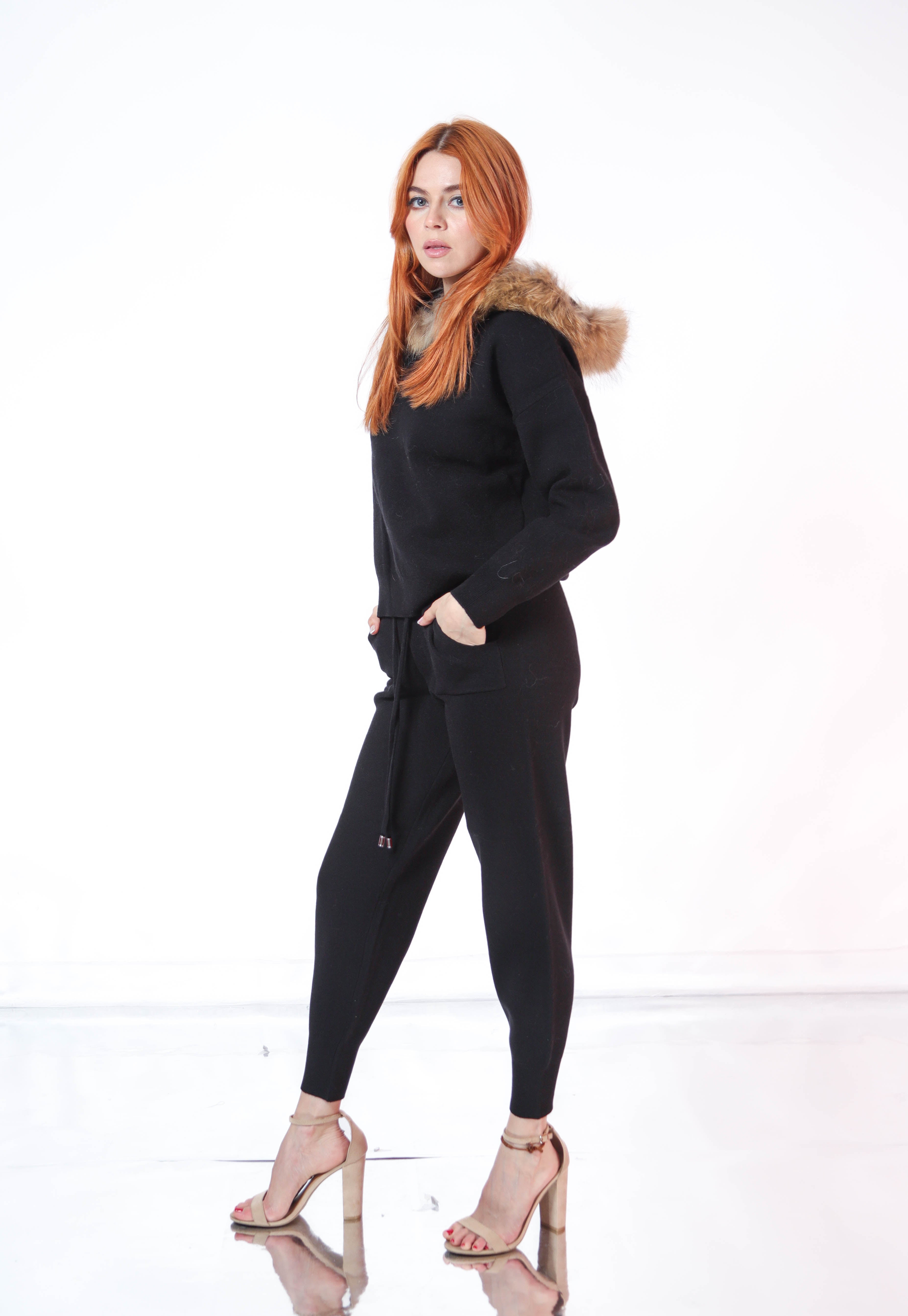 Set pantalon y sudadera de punto con ribete de pielen gorro