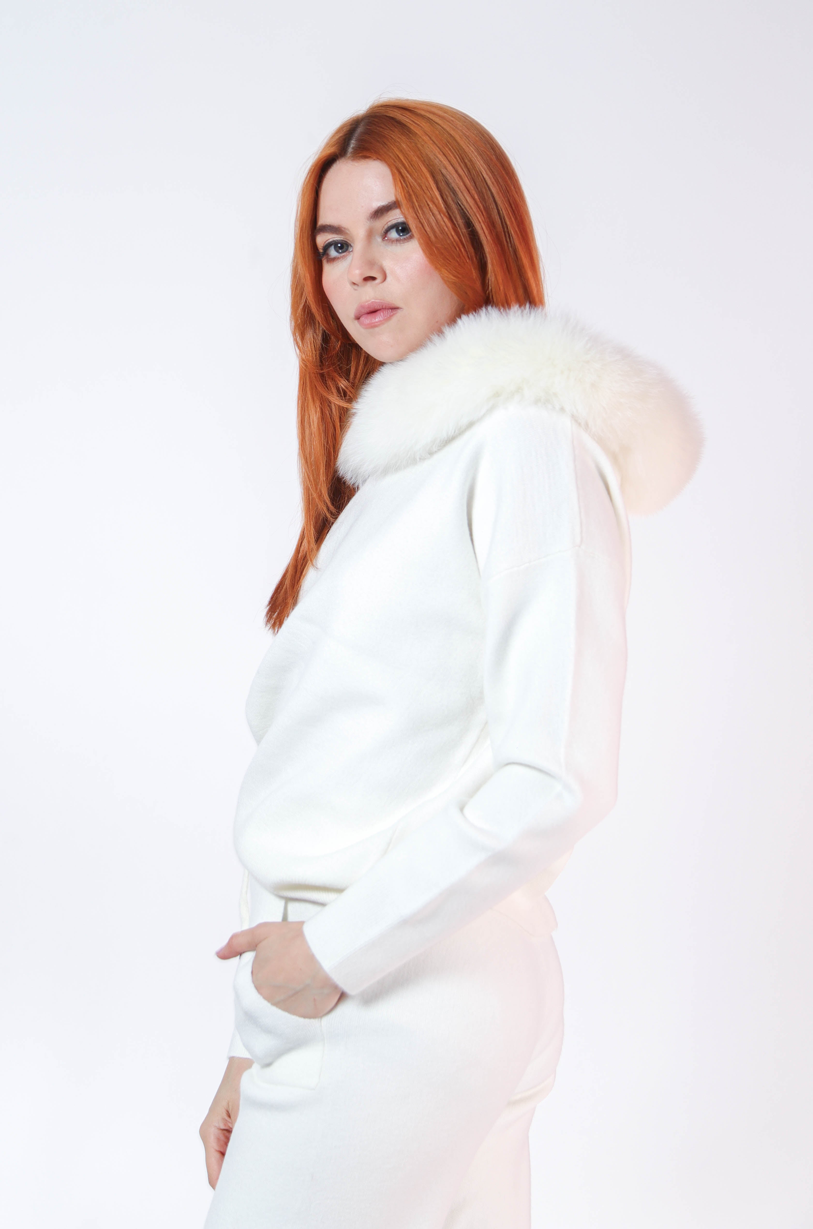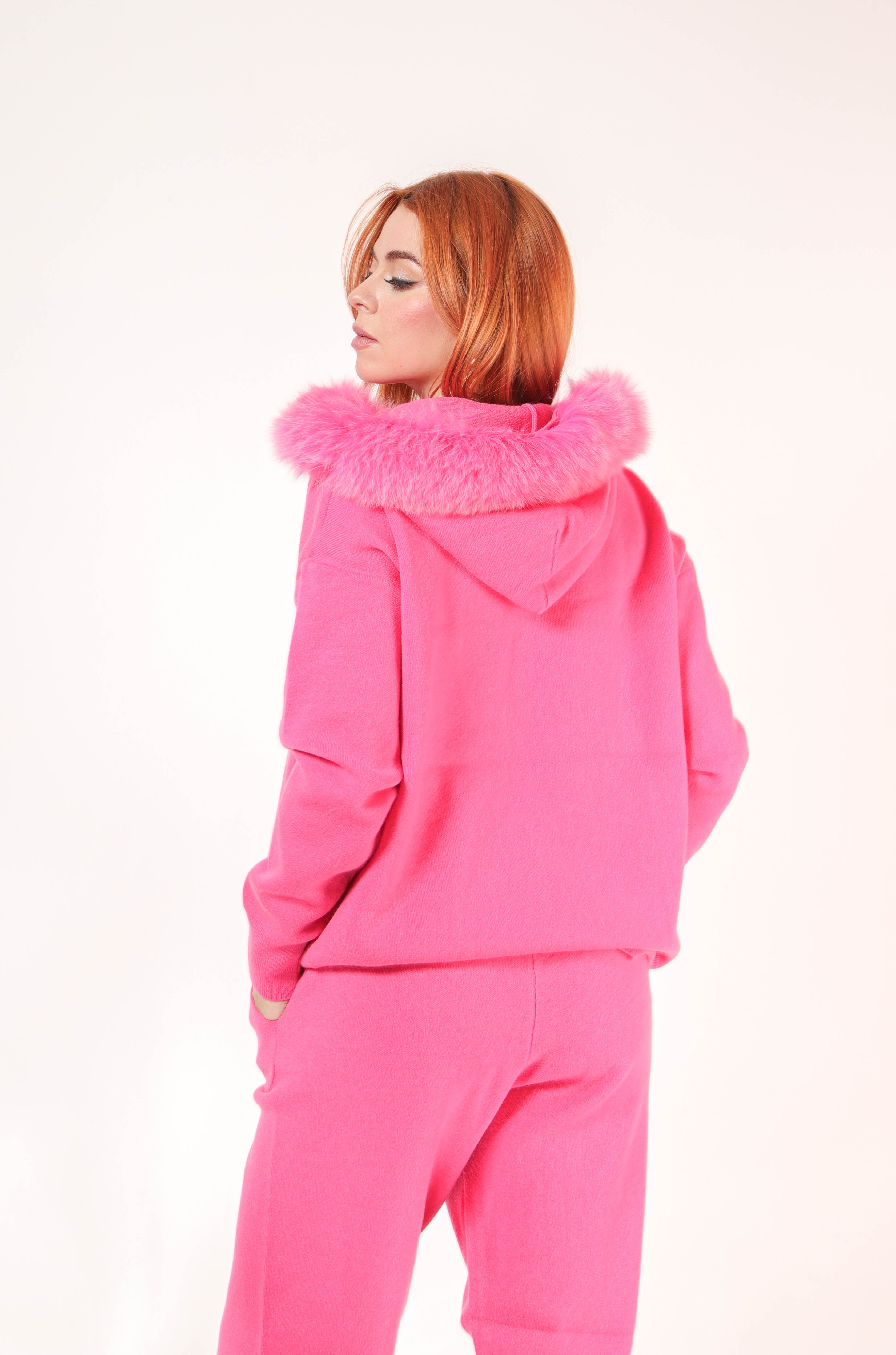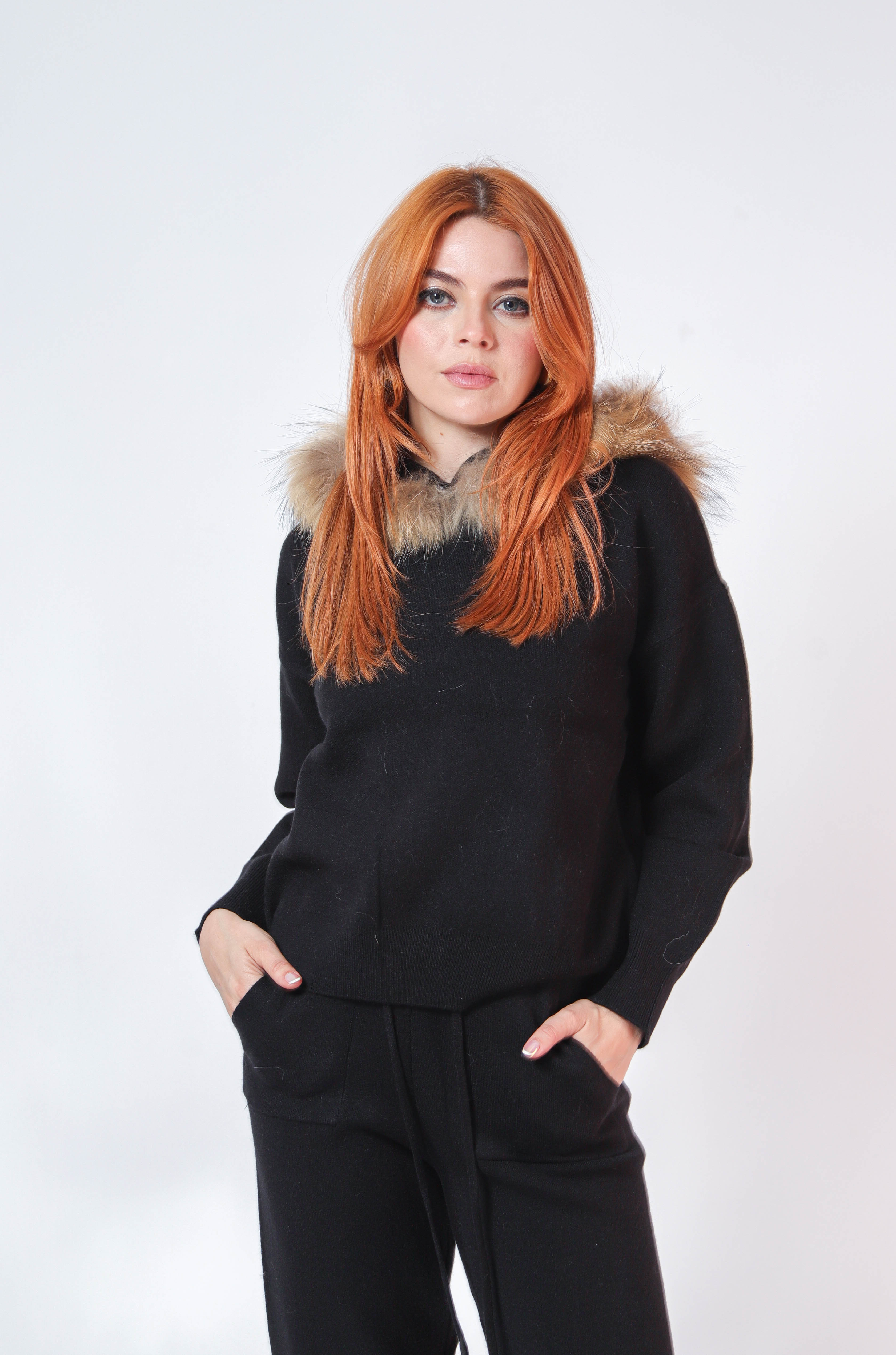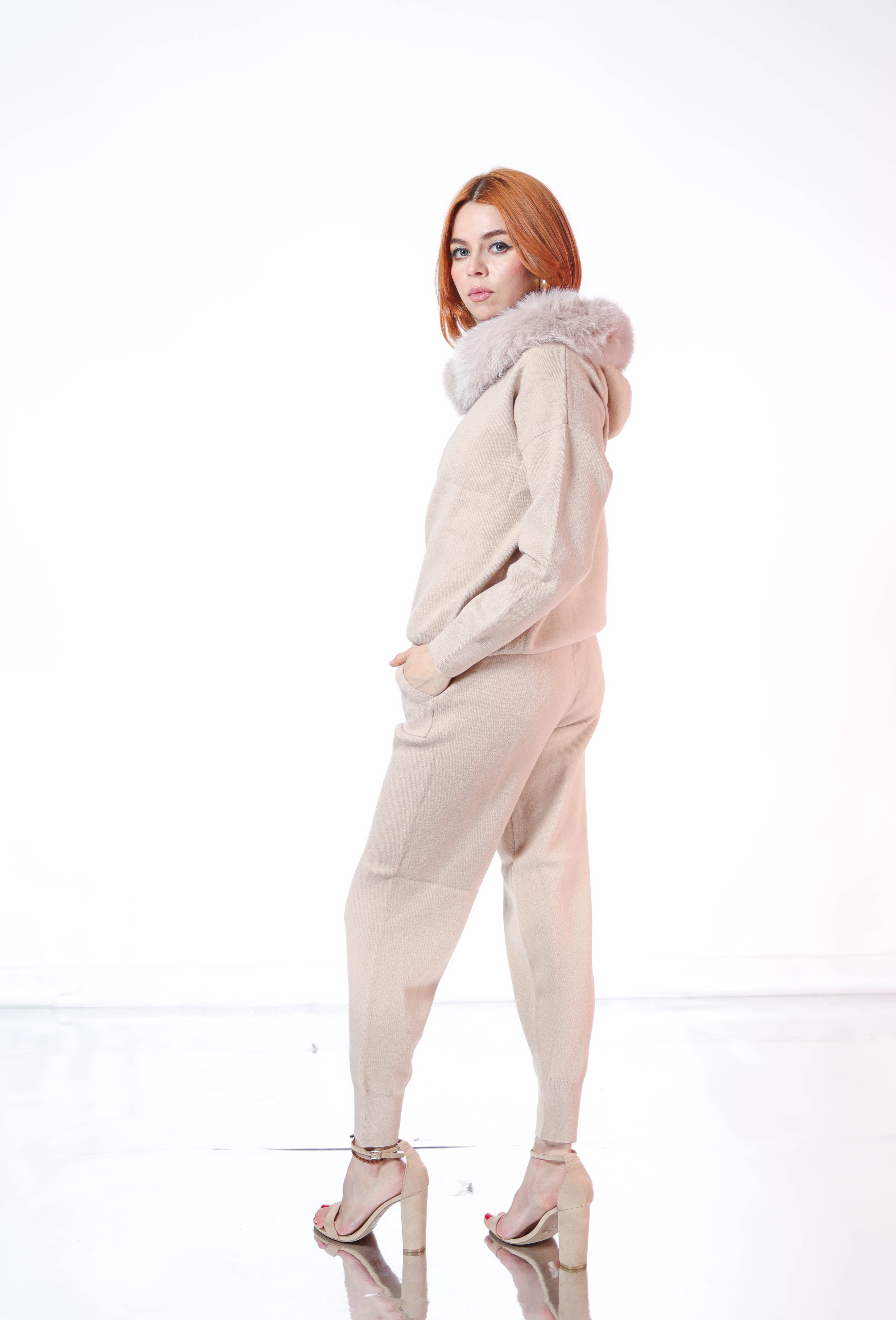 Set pantalon y sudadera de punto con ribete de pielen gorro